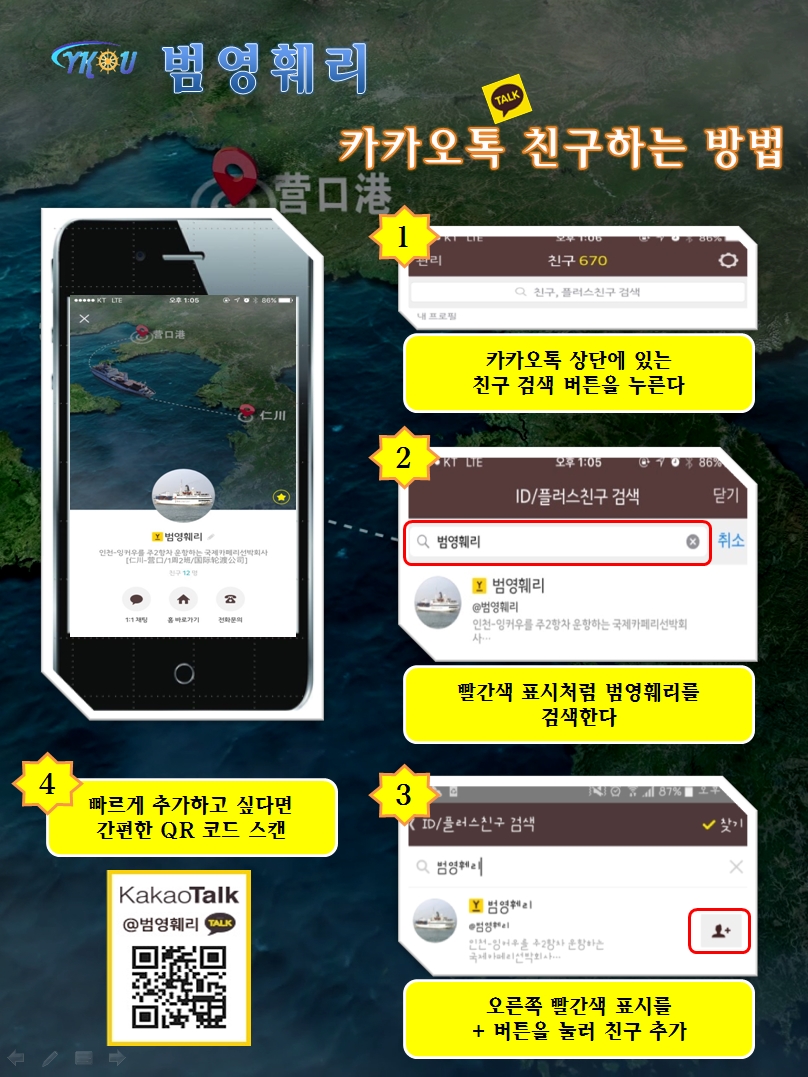 아래 포스터와 같이 범영훼리 카카오톡 친구추가를 하시면,
